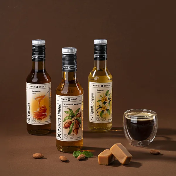 Бренд Pinch&Drop представляет набор сиропов из трех уникальных вкусов: жареный миндаль, ваниль и карамель. Каждый сироп отличается насыщенным ароматом и сбалансированным вкусом, которые делают горячие напитки более изысканными.